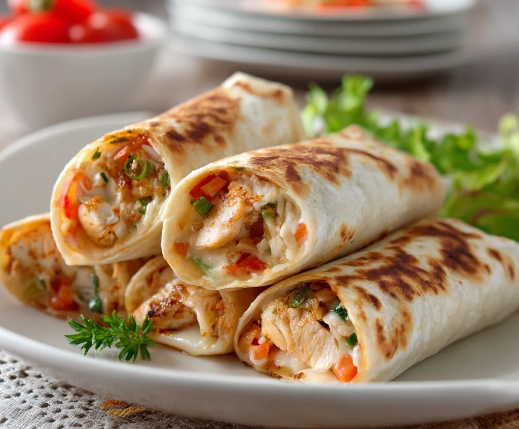 Each wrap has around 350 to 400 calories depending on tortilla size. Chicken provides lean protein while cheese adds calcium and healthy fats. Garlic and parsley enhance taste and bring health benefits.