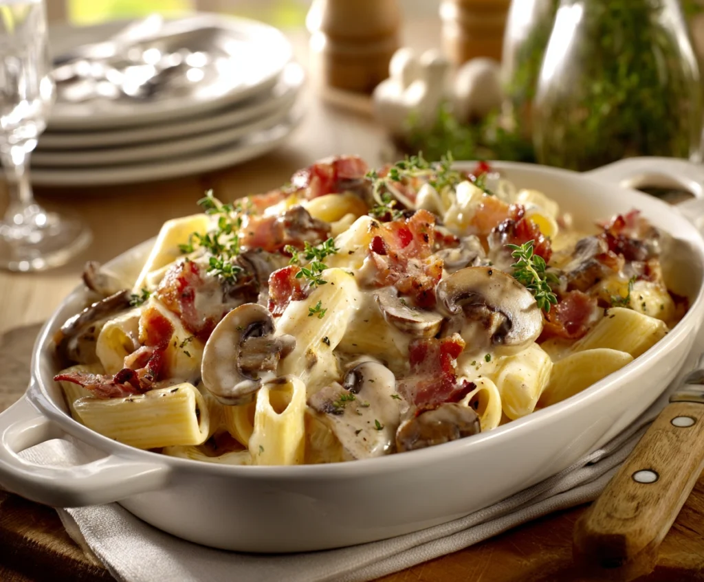 This recipe uses basic ingredients like pasta, bacon, mushrooms, cream, and Parmesan cheese. The result is a flavorful and satisfying pasta dish that pairs well with a light salad or garlic bread.